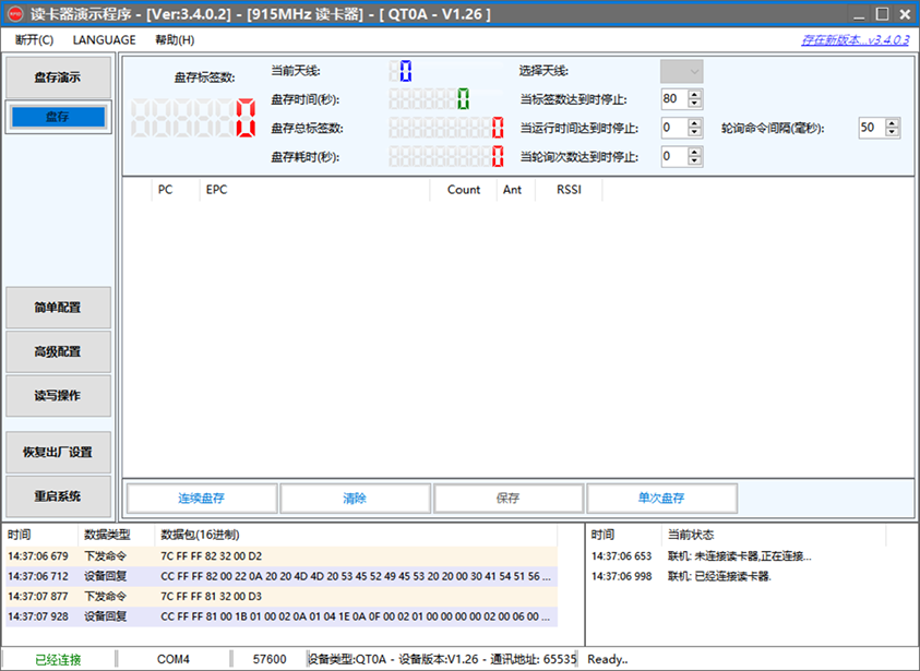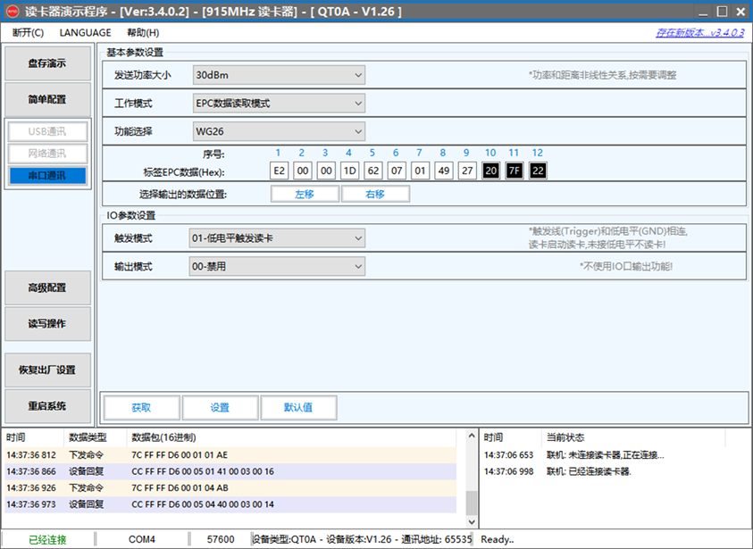 读卡器接上电源后,红色LED长亮,绿灯闪烁2秒,读卡器根据工作环境对自身参数进行自动调谐。