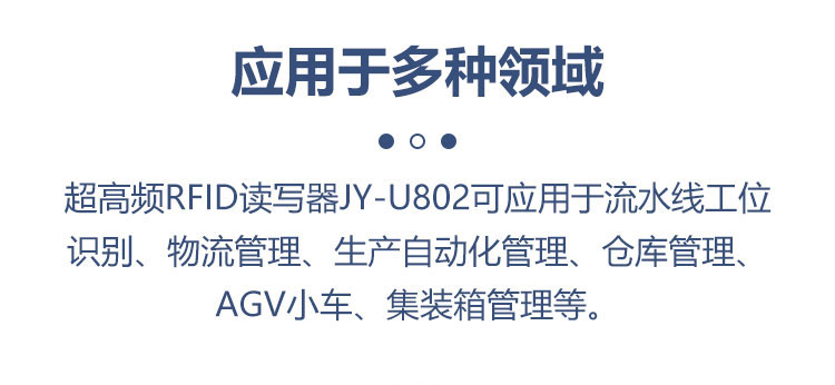 超高频工业RFID读写器JY-U802是一款工作频率为902MHz~928MHz的超高频RFID读写器,最大输出功率30dBm,符合EPC Global Class l Gen 2/IS0-18000-6C / 6B标准,支持标准工业MODBUS RTU现场总线协议,方便组网通信。