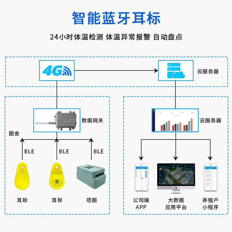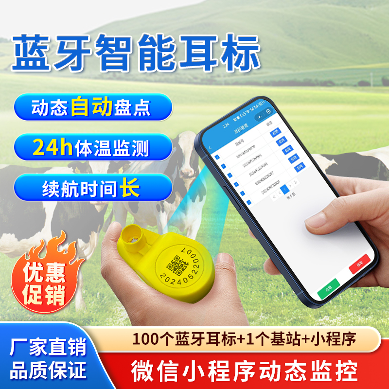 创新!!健永科技首家推出蓝牙耳标小程序,用于管理猪牛羊等动物。设计专为圈养或半圈养牲畜盘点的防拆有源耳标,采用BLE通信技术,实现耳标与基站之间的通信,通信半径可在100M以上,同时与科智牧微信小程序绑定,盘点结果自动推送到手机公众号及小程序,实时查看养殖场盘点情况。
